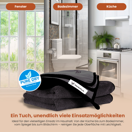 Die leicht strukturierte Rückseite eignet sich hervorragend, um leichte Schmutz- und Kalkablagerungen mühelos zu entfernen. Gleichzeitig ist sie perfekt, um Armaturen und Glasoberflächen streifenfrei auf Hochglanz zu polieren. Die andere Seite, ausgestattet mit extrem saugfähigen Fasern, absorbiert ein Vielfaches ihres Eigengewichts an Flüssigkeit – für ein besonders schnelles und effizientes Trocknen.